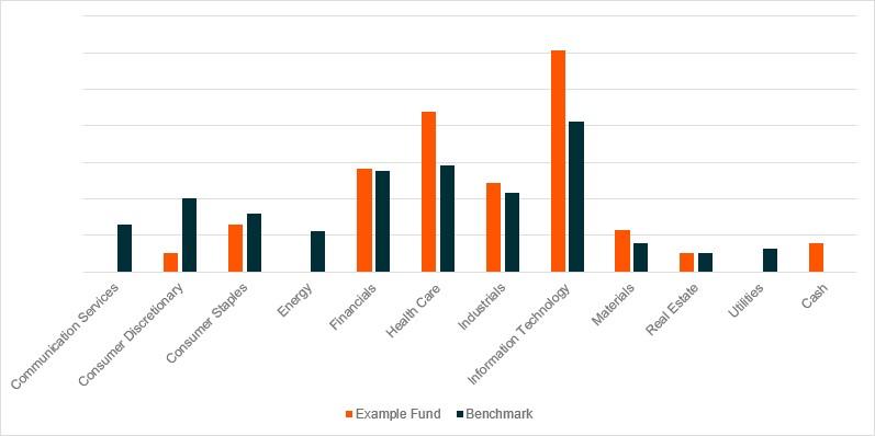 Taking a very simple example as shown in the chart below, an adviser may fail to meet client expectations if they have the client invested in what they believe to be an actively managed diversified global equities fund, but in reality, the fund has a strong skew towards high growth stocks such as tech because of the more selective, subjective nature of active management. This mismatch of expectations can also be exacerbated due to the level of secrecy or delay active funds may have in reporting their holdings.